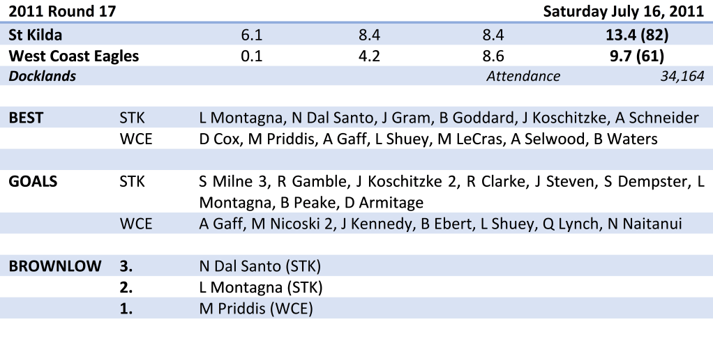 Leigh Montagna and Nick Dal Santo starred from the outset, combining for 27 disposals in the opening term as the Saints piled on six goals to nil in a dominant start. When Ryan Gamble kicked his second goal inside the first minute of the second quarter, the Saints held a 43 point lead and the Eagles appeared all at sea.