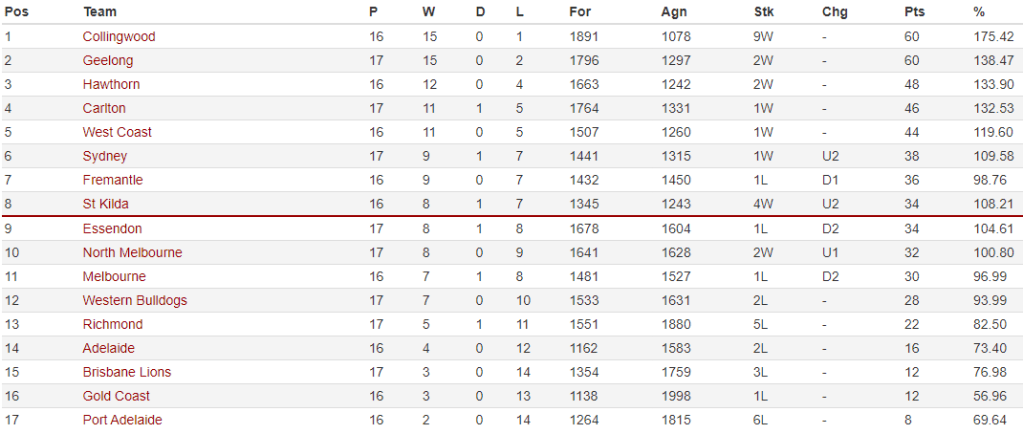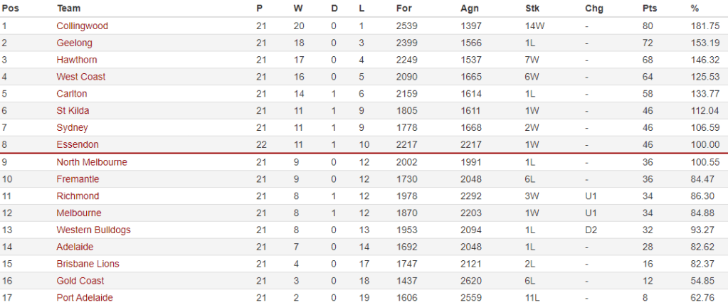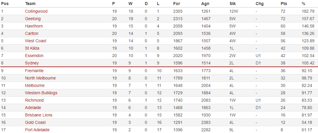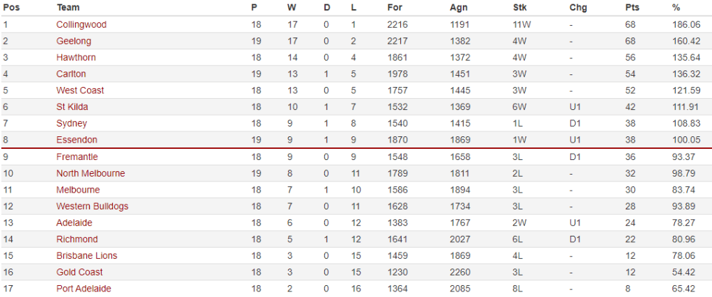 However, they remained six points behind West Coast, who also had a game in hand, to leave the fight for the double chance down to a race in five. Collingwood and Geelong continued on their merry way at the top of the ladder with the Magpies and Cats recording easy wins over Gold Coast and Richmond.