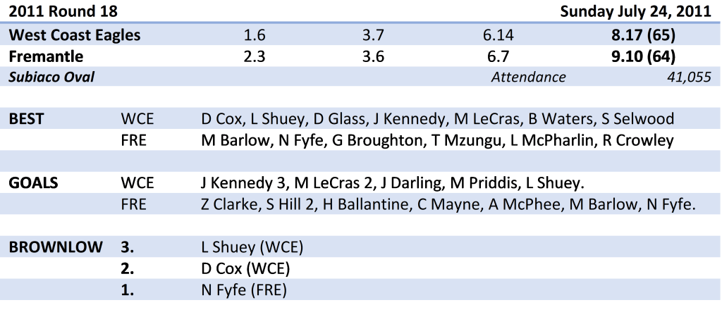 Cox tallied 22 disposals and a number of important marks in the final term as part of his medal-winning performance, although Shuey arguably was the Eagles’ best with his showing in the midfield. With both Matt Priddis and Andrew Embley well held by Crowley and Mzungu, Shuey picked up the slack around the stoppages, along with Scott Selwood, who won his battle with Matthew Pavlich, and Matt Rosa.