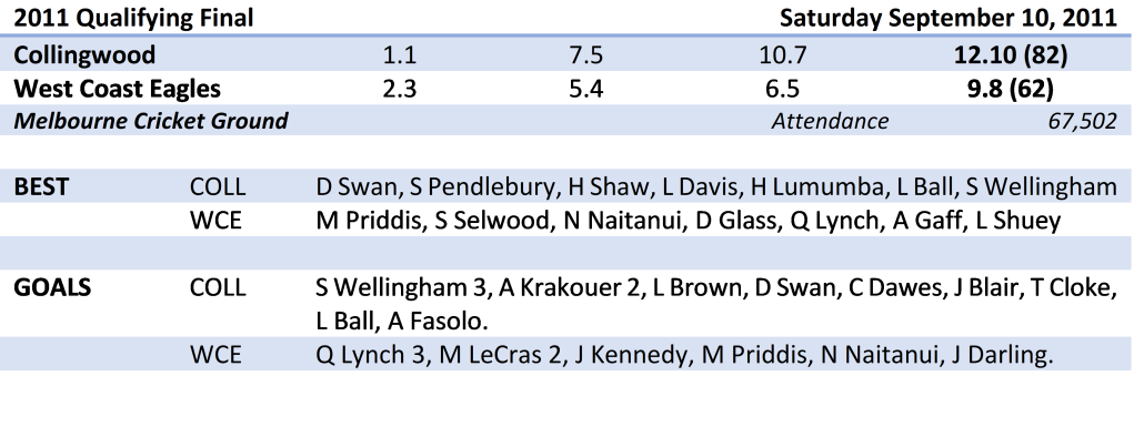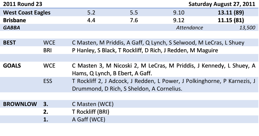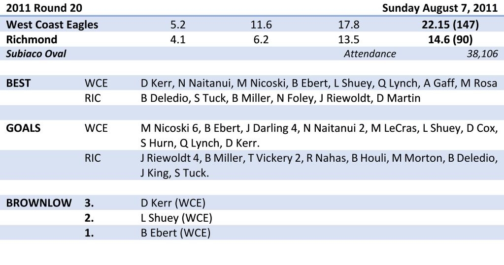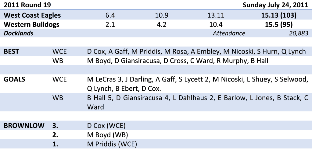 The Eagles midfield were in complete control from the first half, with Andrew Embley (20 disposals, three clearances), Daniel Kerr (15 disposals, four clearances) and Matt Priddis (14 disposals, four clearances) all prominent.