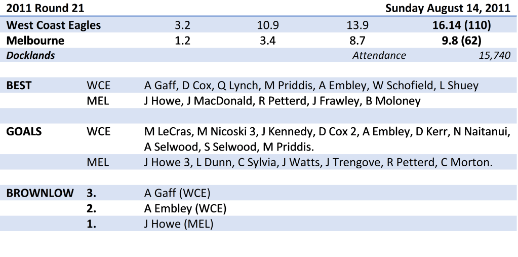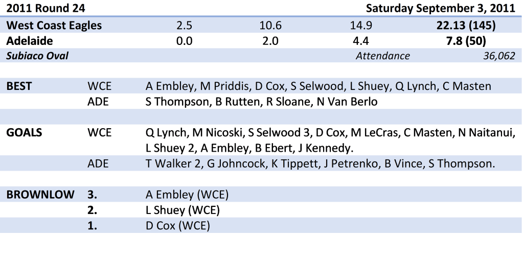 Andrew Embley was outstanding for West Coast for four quarters, picking up 32 touches on top of kicking the sealing goal. Matt Priddis did much of the grunt work in the middle, while Shannon Hurn and Daniel Kerr each picked up 24 touches. Brad Ebert quelled the influence of Matthew Scarlett and chimed in for 20 disposals and a goal and Matt Rosa was important in the last quarter.