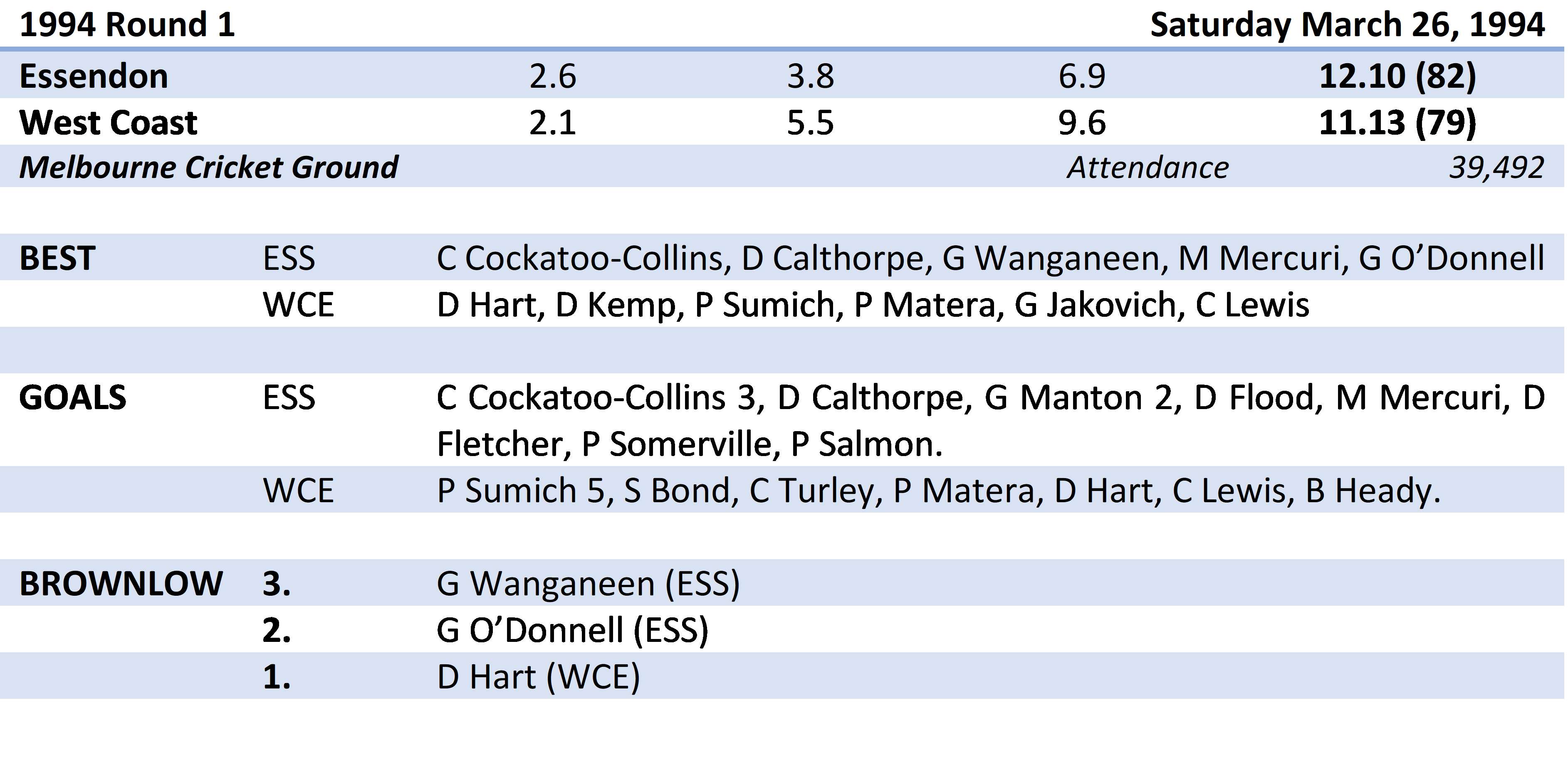 Cockatoo-Collins was the leading goal scorer for Essendon with three from 21 possessions, while Calthorpe and Manton finished with two apiece. Mark Mercuri led the ball winners for the Bombers with 28, while Gavin Wanganeen had 25 out of defence and centreman Gary O’Donnell finished with 24.