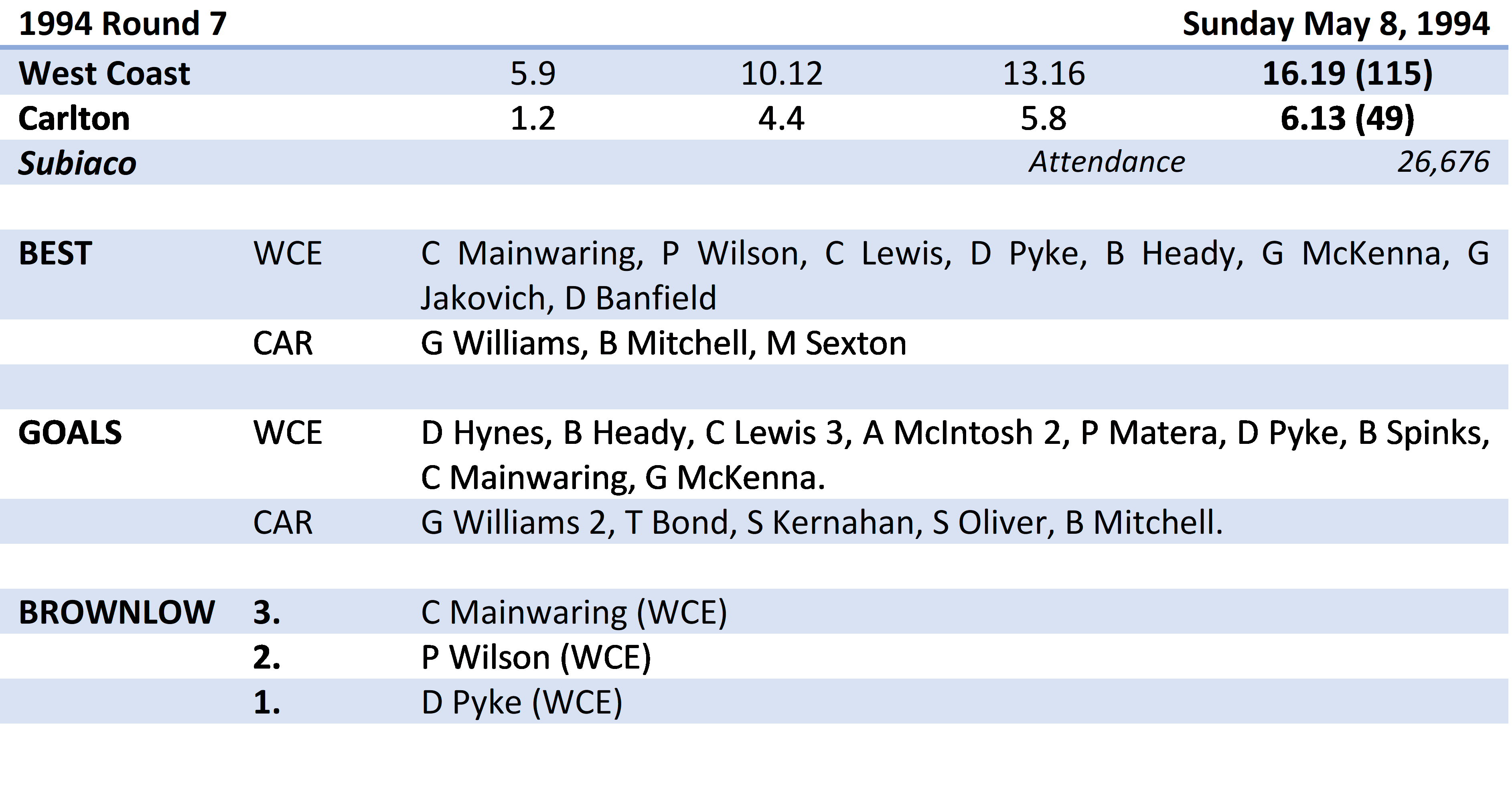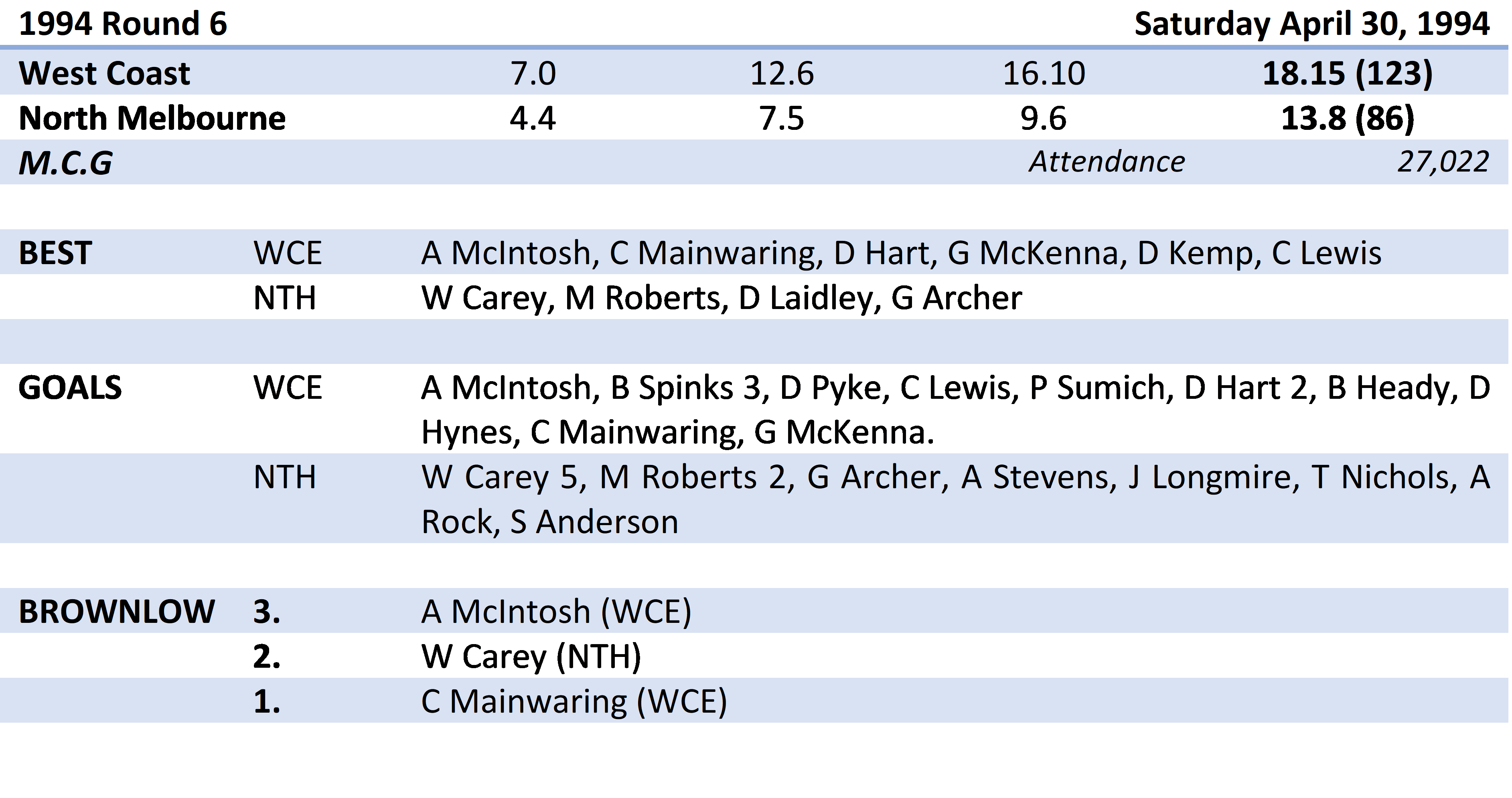 With eight wins from their opening ten games, the Eagles were one win better off than at the same time in 1993. The Eagles had recorded wins over North Melbourne and Melbourne at the MCG, as well as thumping Carlton at home. Still, Malthouse was cautious over the Eagles’ standing.