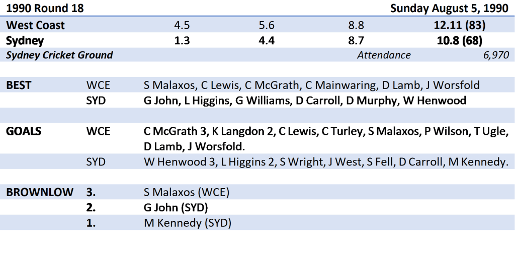 Into the West Coast line up were John Worsfold, who returned from serving a two week ban, Craig McGrath who was a late withdrawal the week before, as well as Scott Watters, Dean Turner and Murray Rance who forced his way into the side after six weeks in the WAFL.