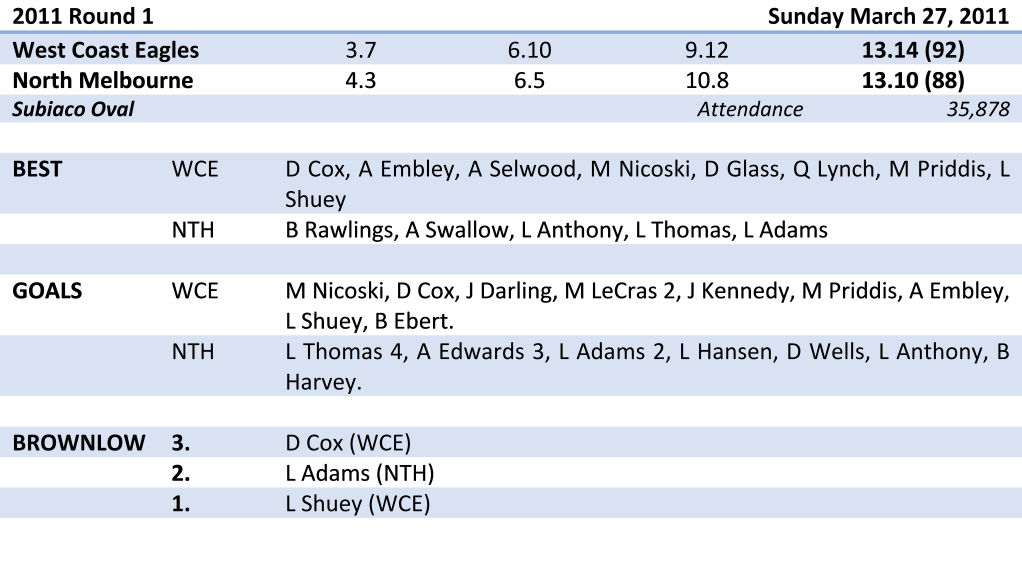 Andrew Embley booted four goals to go with 32 disposals in a best afield display, while Josh Kennedy and Luke Shuey each kicked three. Kennedy had the better of Jackson Trengove early to boot his three goals by half time, while Embley and Shuey combined for the Eagles’ last six goals as West Coast became the first team since Collingwood in 2000 to win their first two games after claiming the wooden spoon the year before.