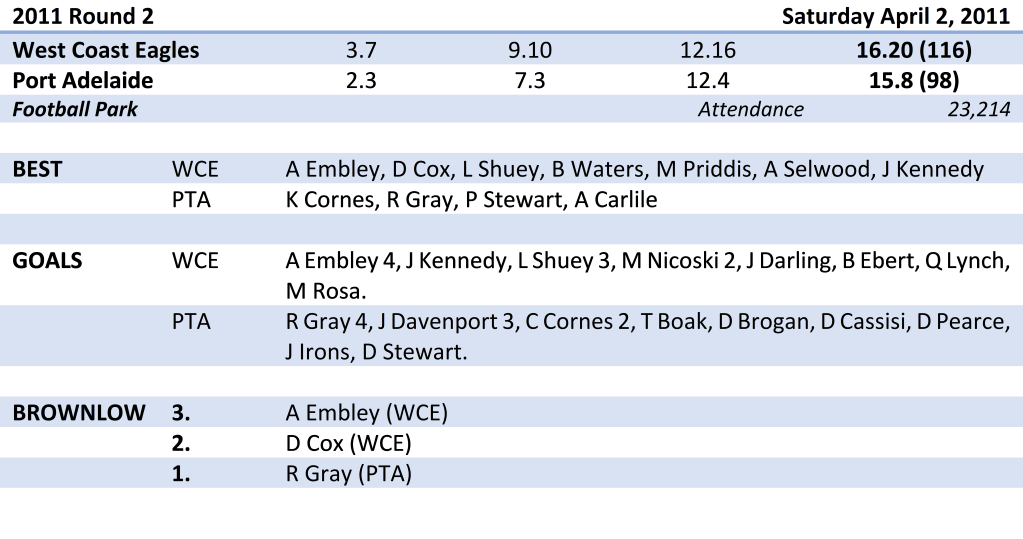 As they had done the week before, West Coast started strongly, but inaccuracy prevented the visitors from establishing a larger lead. Josh Kennedy and Quinten Lynch kicked truly early in the second term to stretch the Eagles lead to 22 points before Port Adelaide got their foot into the game.